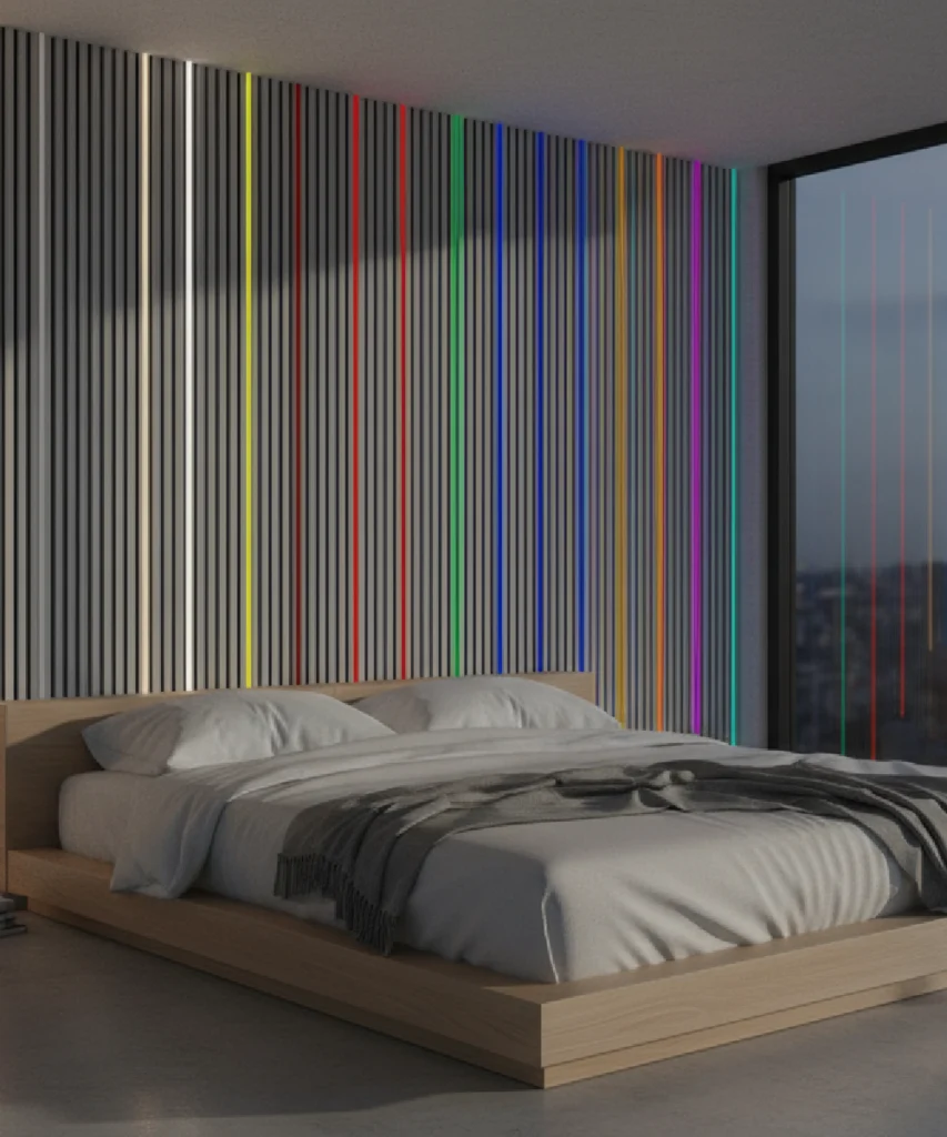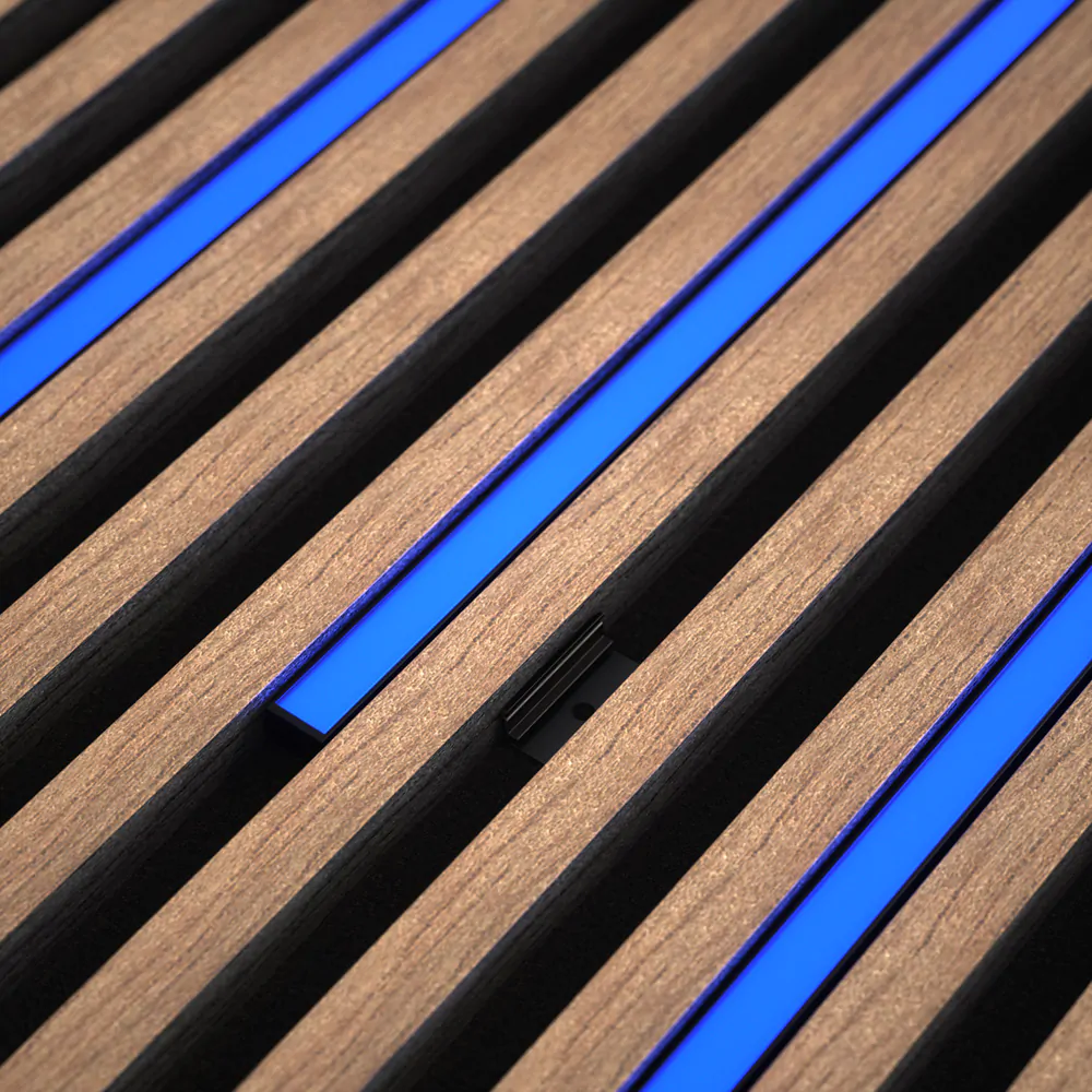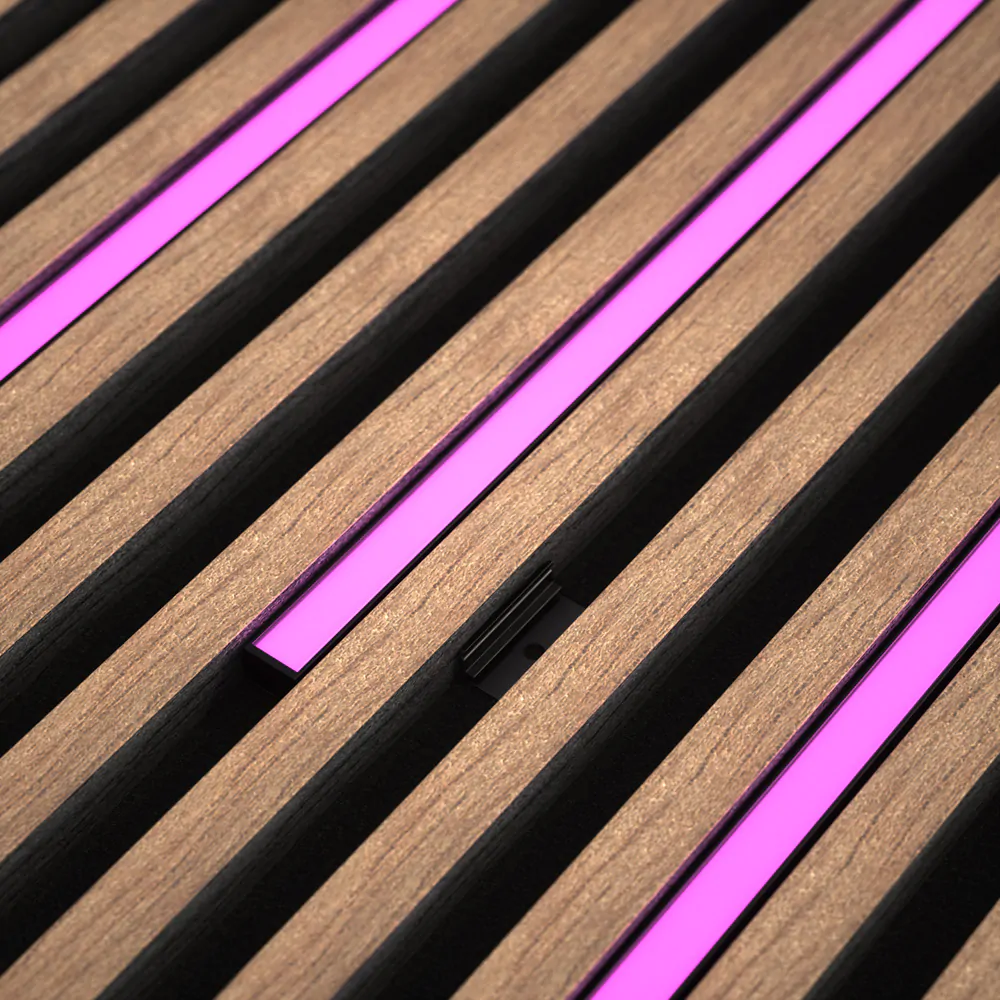 DarkMatters LED strips disappear completely when turned off, blending seamlessly into your slat walls. Ultra-thin and discreet.