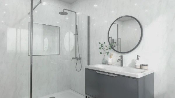 The glossy marble Lightning shower panels feature a unique yet understated finish, accentuated by interweaving veins of grey swirls for a striking effect. These panels serve as an excellent alternative to tiles, offering simple application, 100% waterproof with easy cleaning and maintenance.