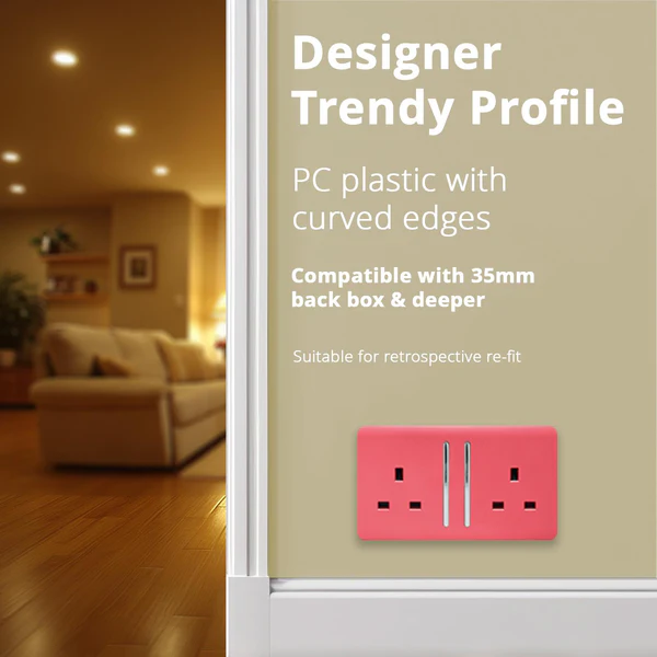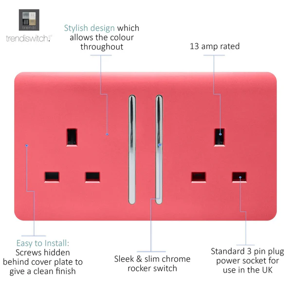 The Trendi Switch range of 2 gang 13 amp plug sockets comprise of a sleek chrome rocker switch on a “screwless” plate displaying the complete colour of the products. This is supported by a back frame that houses the screw holes & module for the product to be installed into compatible back boxes and wiring.